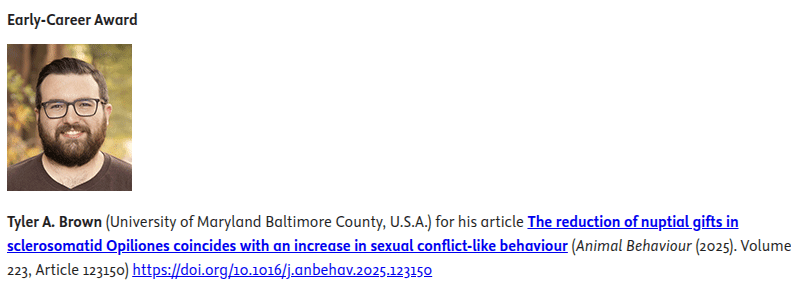 Congratulations to postdoc Dr. Tyler Brown for winning the Early Career Award – Best Paper Prize for his manuscript The reduction of nuptial gifts in sclerosomatid Opiliones coincides with an increase in sexual conflict-like behaviour, work he completed in the lab of Dr. Mercedes Burns!